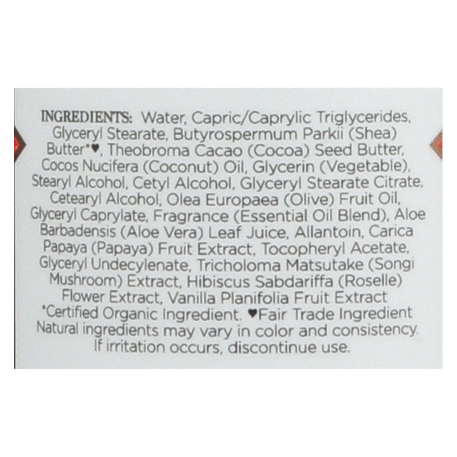 ingredients : water;capric/caprylic triglycerides;glyceryl stearate;butyrospermum parkii;shea;butter*♥;theobroma cacao;cocoa;seed butter;cocos nucifera;coconut;oil;glycerin;vegetable;stearyl alcohol;cetyl alcohol;glyceryl stearate citrate;cetearyl alcohol;olea europaea;olive;fruit oil;glyceryl caprylate;fragrance;essential oil blend;aloe barbadensis;aloe vera;leaf juice;allantoin;carica papaya;papaya;fruit extract;tocopheryl acetate;glyceryl undecylenate;tricholoma matsutake;songi mushroom;extract;hibiscus sa