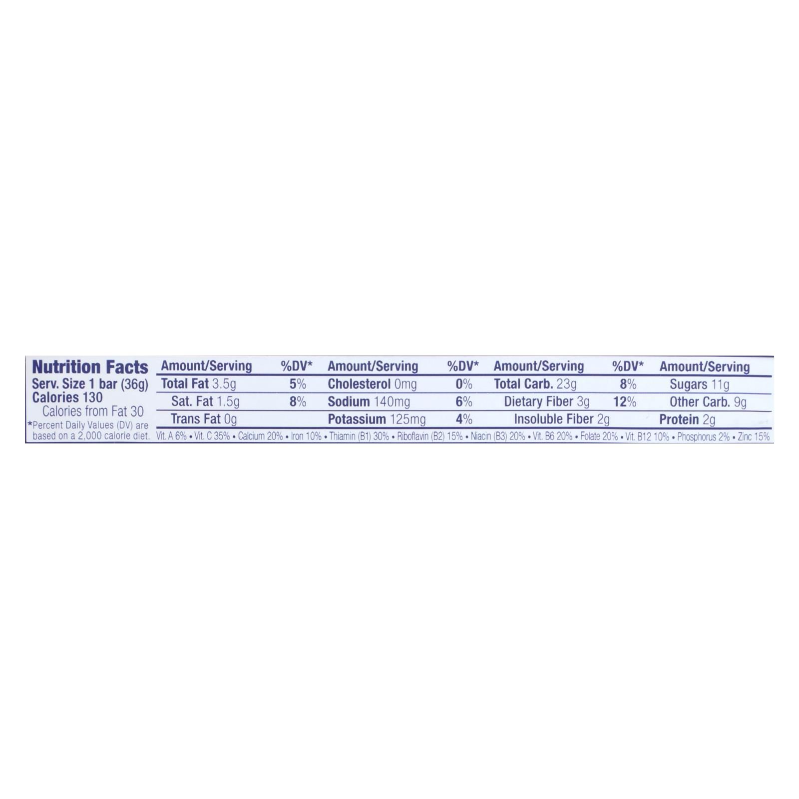ingredients : organic oat blend;organic rolled oats;organic oat flour;organic oat fiber;organic tapioca syrup;organic chocolate chips;organic dried cane syrup;organic unsweetened chocolate;organic cocoa butter;organic soy lecithin;organic vanilla extract;organic cane syrup;organic fig paste;organic cocoa;organic soy butter;organic roasted soybeans;organic soybean oil;salt;natural flavors;organic milled flaxseed;organic sunflower oil;sea salt;baking soda. Vitamins & minerals: calcium carbonate;dicalcium ph