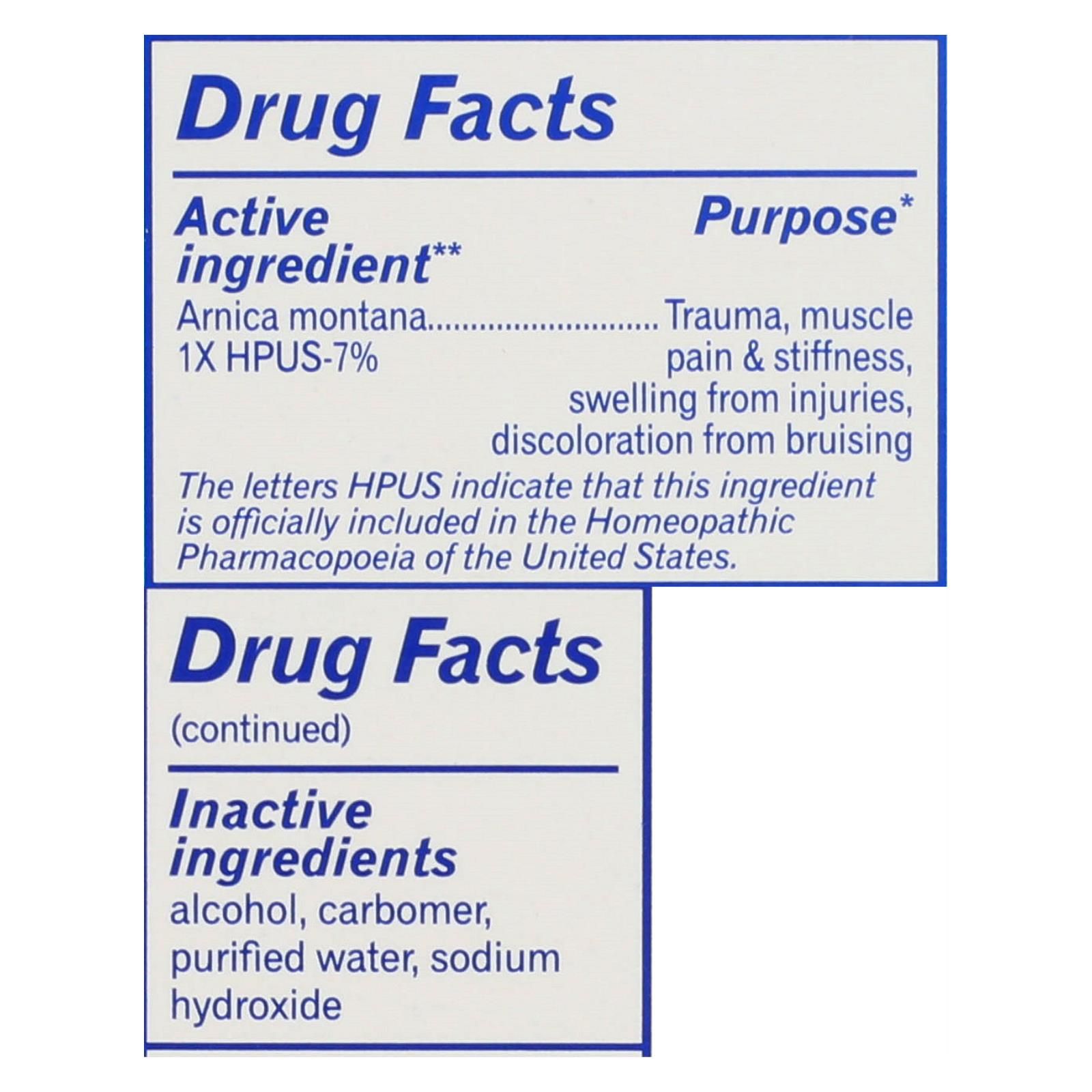 ingredients : active ingredient** purpose* arnica montana 1x hpus-7% trauma;muscle pain & stiffness;swelling from injuries;discoloration from bruising inactive alcohol;carbomer;purified water;sodium hydroxide