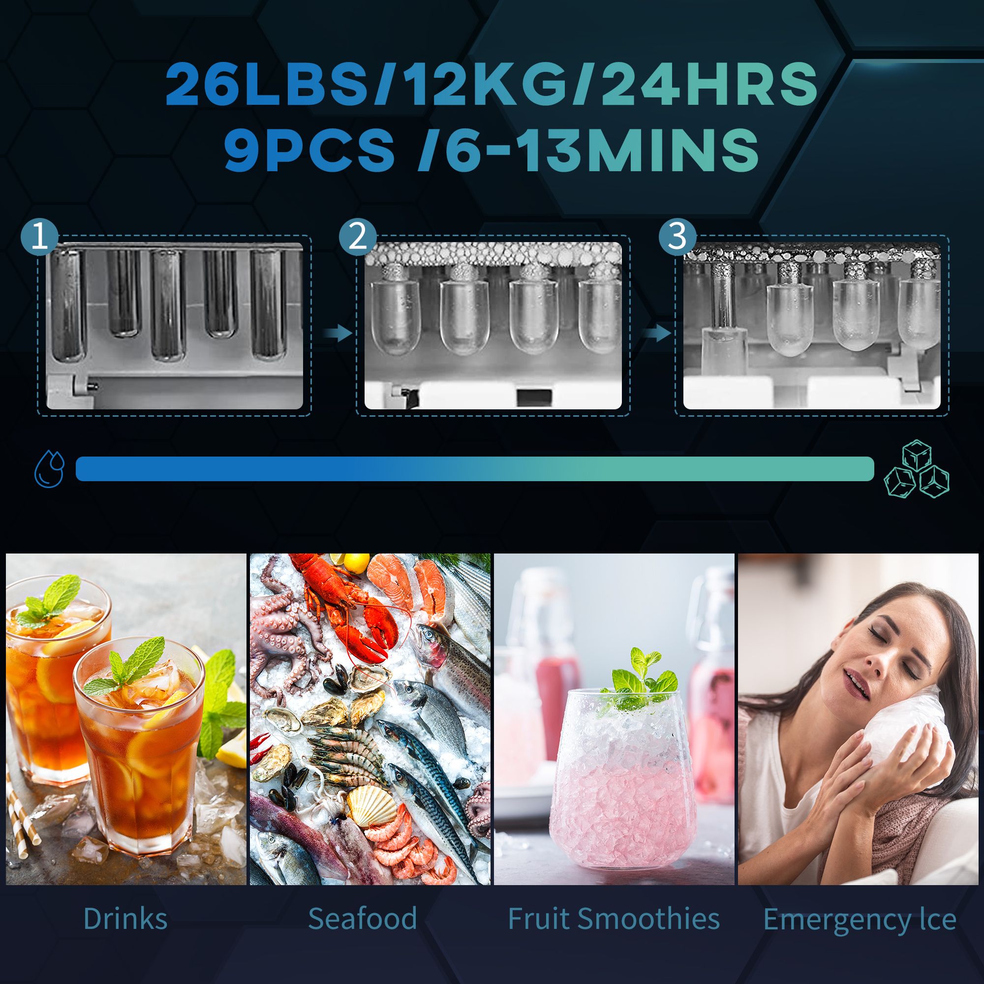• Quick and Efficient: Thanks to its 0.3 gallon (1.3 L) water tank, this ice cube maker can produce 9 pcs bullet-shaped ice cubes in just 6 to 13 minutes and a total of 26lbs (12kg) of ice every 24 hours. Producing ice is fast with the air cooling system. Making it capable of meeting the ice demands of your entire family or gathering parties.