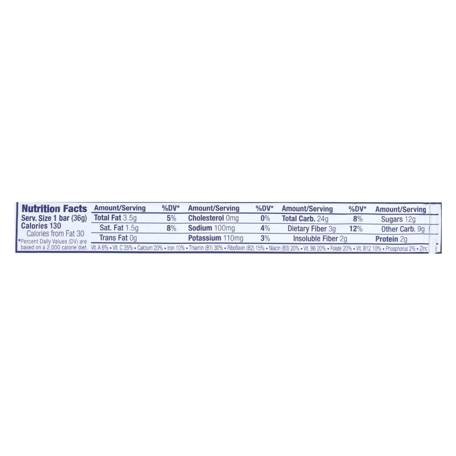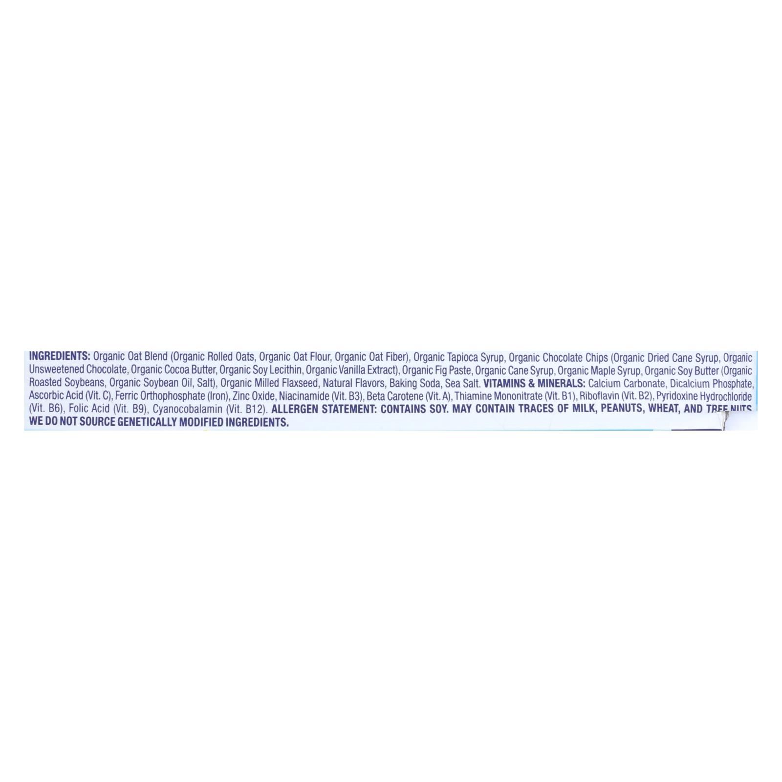 ingredients : calcium carbonate;dicalcium phosphate;ascorbic acid;vit. C;ferric orthophosphate;iron;zinc oxide;niacinamide;vit. B3;beta carotene;vit. A;thiamine mononitrate;vit. B1;riboflavin;vit. B2;pyridoxine hydrochloride;vit. B6;folic acid;vit. B9;cyanocobalamin;vit. B12;organic oat blend;organic rolled oats;organic oat flour;organic oat fiber;organic tapioca syrup;organic chocolate chips;organic dried cane syrup;organic unsweetened chocolate;organic cocoa butter;organic soy lecithin;organic vanilla extra