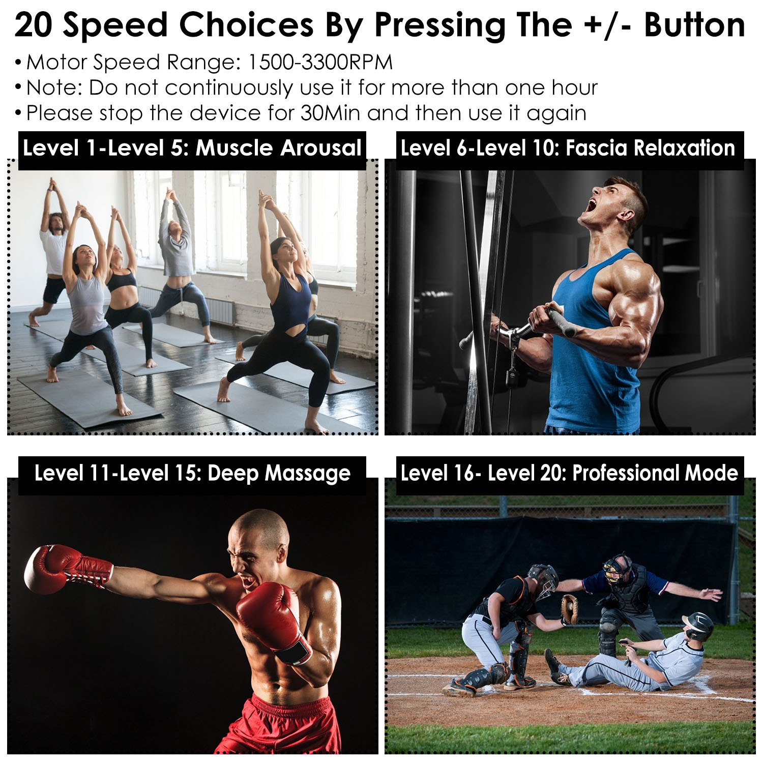 • Deep Tissue Massage: Powerful gun massager with 20level massage intensities that produces up to 3300 rpm blaster to work on different body tissues and muscles. It is a perfect tool to therapy muscle or joints issues, muscle pain relief and relaxing which is necessary to improve your health.