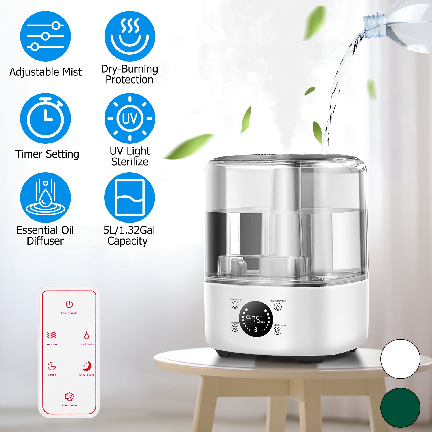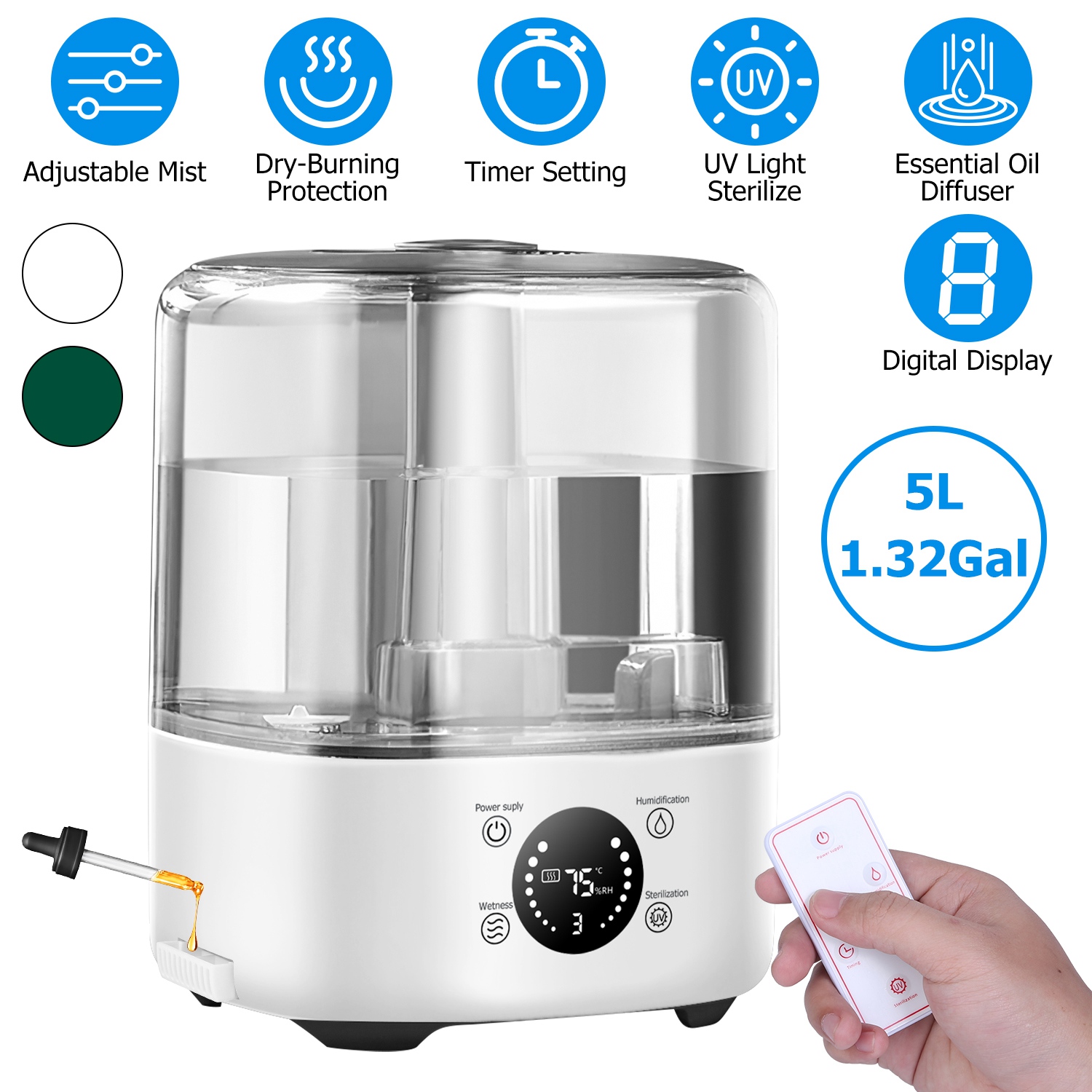 Home > 5L/1.32Gal Ultrasonic Air Humidifier Electric Mist Humidifier with Temperature Humidity Sensor Timer Setting UV Light Adjustable Mist Level Quiet Esse