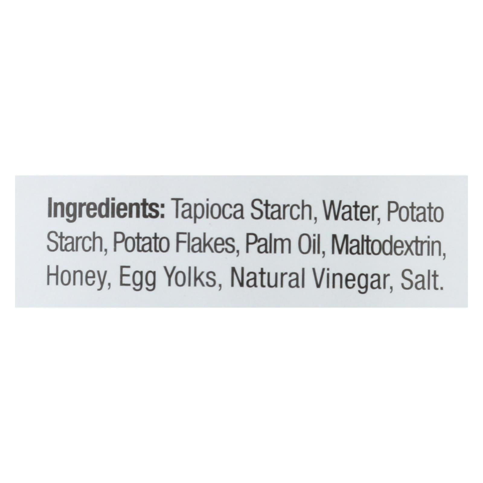ingredients : tapioca starch;water;potato starch;potato flakes;palm oil;maltodextrin;honey;egg yolks;natural vinegar;salt