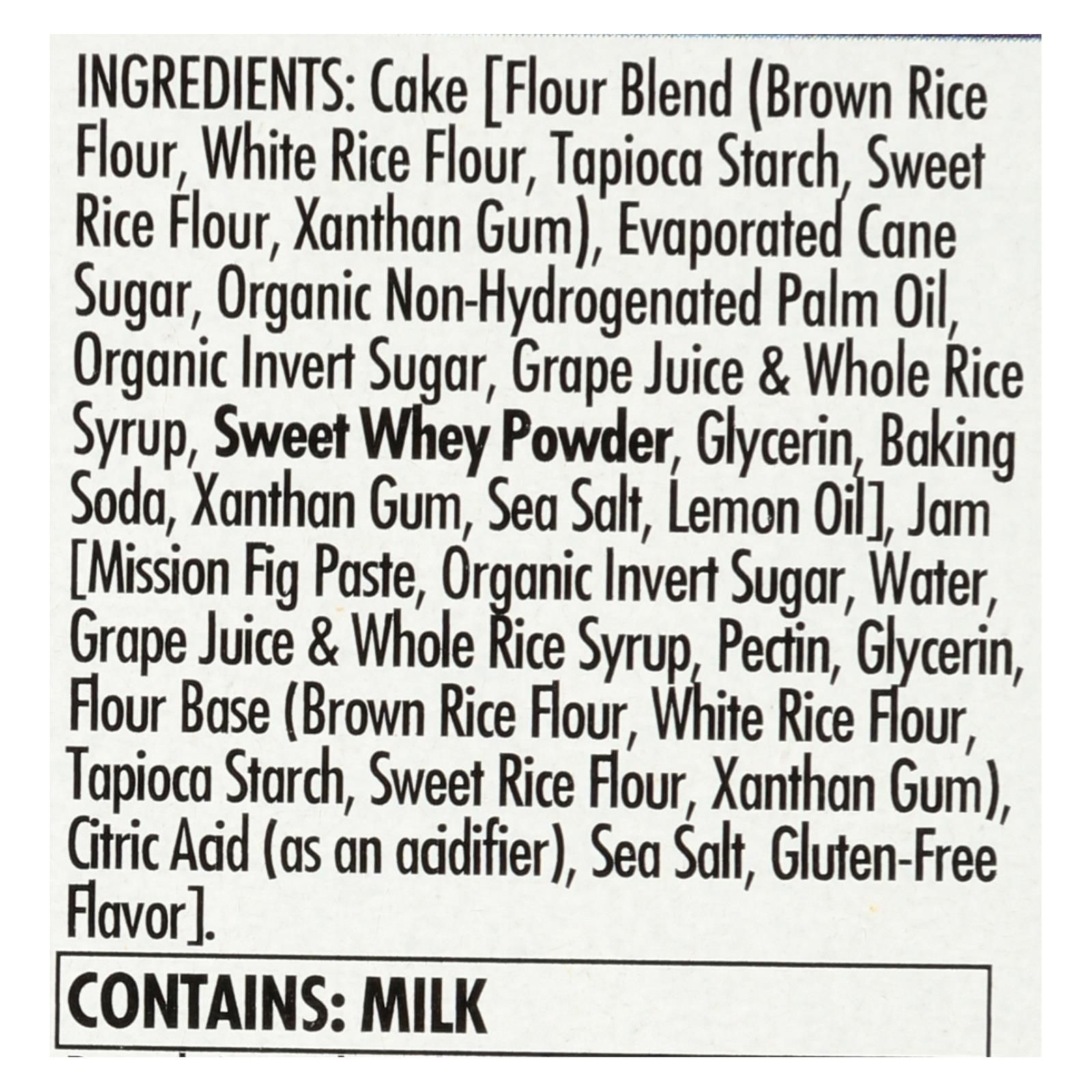ingredients : cake [flour blend;brown rice flour;white rice flour;tapioca starch;sweet rice flour;xanthan gum;evaporated cane sugar;organic non-hydrogenated palm oil;organic invert sugar;grape juice & whole rice syrup;sweet whey powder;glycerin;baking soda;sea salt;lemon oil];jam [mission fig paste;water;pectin;flour base;citric acid;as acidifier;gluten-free flavor]