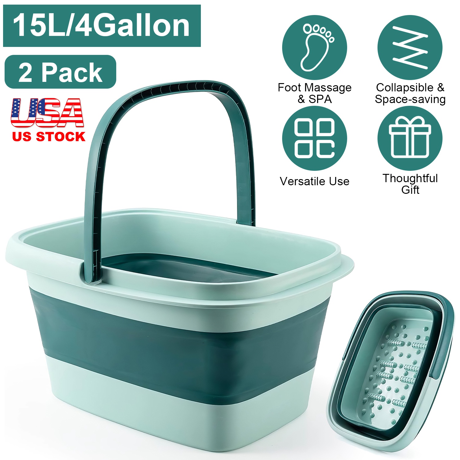2 Pack Collapsible Foot Bath Basin 15L/4Gallon Foot Soak Tub Multifunctional Foot Bucket with Handle 8 Massage Rollers 54 SPA Bumps