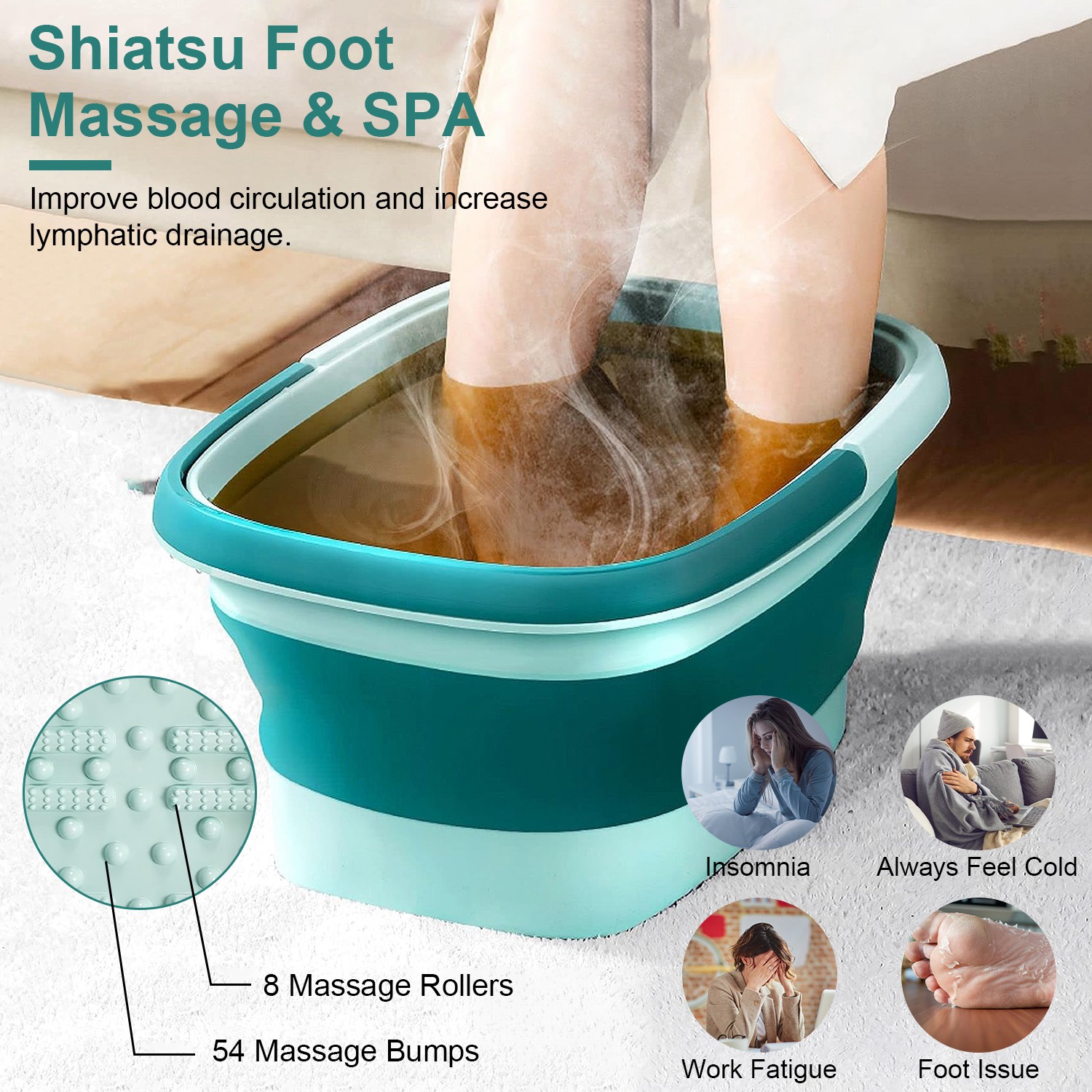 • Comfortable Foot Massager: Designed with 8 massage rollers and 54 massage bumps in the bottom, our foldable foot tub allows you to enjoy Shiatsu massage, which can clean the dead skin, effectively improve blood circulation and relieve your fatigue from work. Add some foot soak salts or lymphatic drainage ginger into the hot water and enjoy your comfortable foot massage.