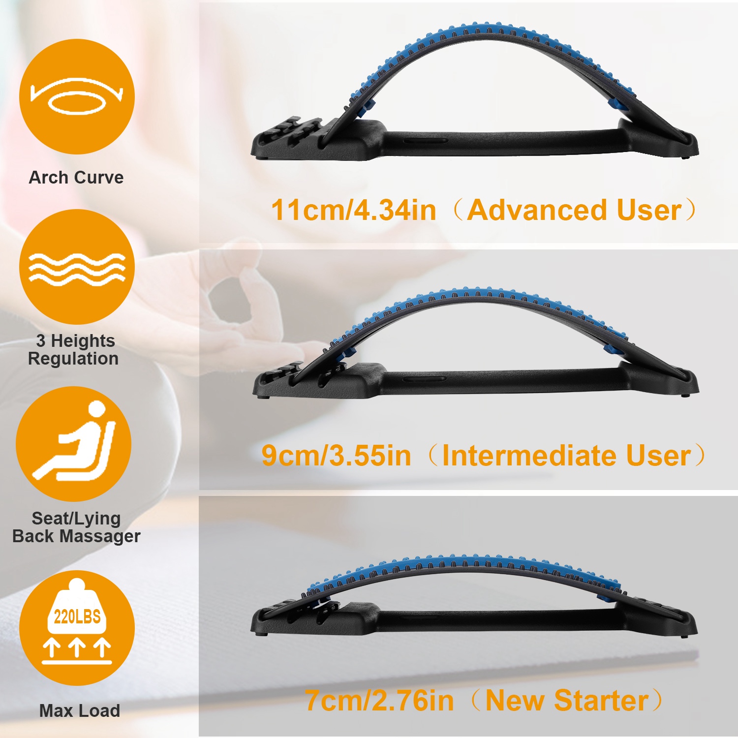 • *3 HEIGHTS ADJUSTABLE: 2.76in/3.55in/4.34in These 3 adjustable settings, suit for initial user or sport lovers! You can fix this back stretcher device at the most comfortable level for easy stretching and effective pain relief. The higher the back stretcher, the more stretch you get.