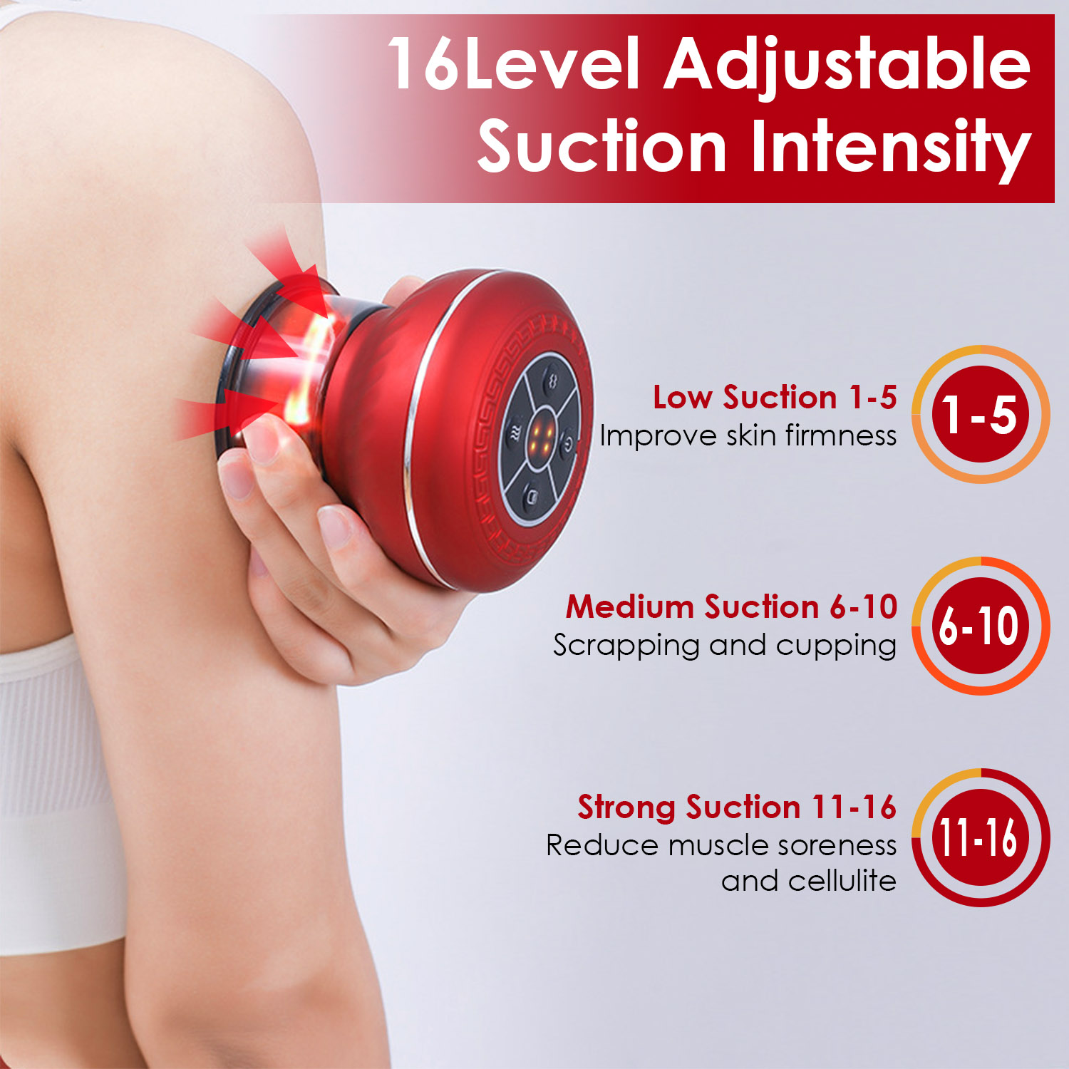 • 16Level Temperature & Suction: Come with 16 levels of red light heating therapy and suction pressure, you can choose the desired level according to personal demands. Up to 113°F temperature works great on breaking down the excess lactic acid in the muscles and promoting blood circulation. Additionally, deep negative pressure mode is aimed for people after intense training while smooth breathing mode helps relieve body fatigue by rhythmical and continuous suction and release.