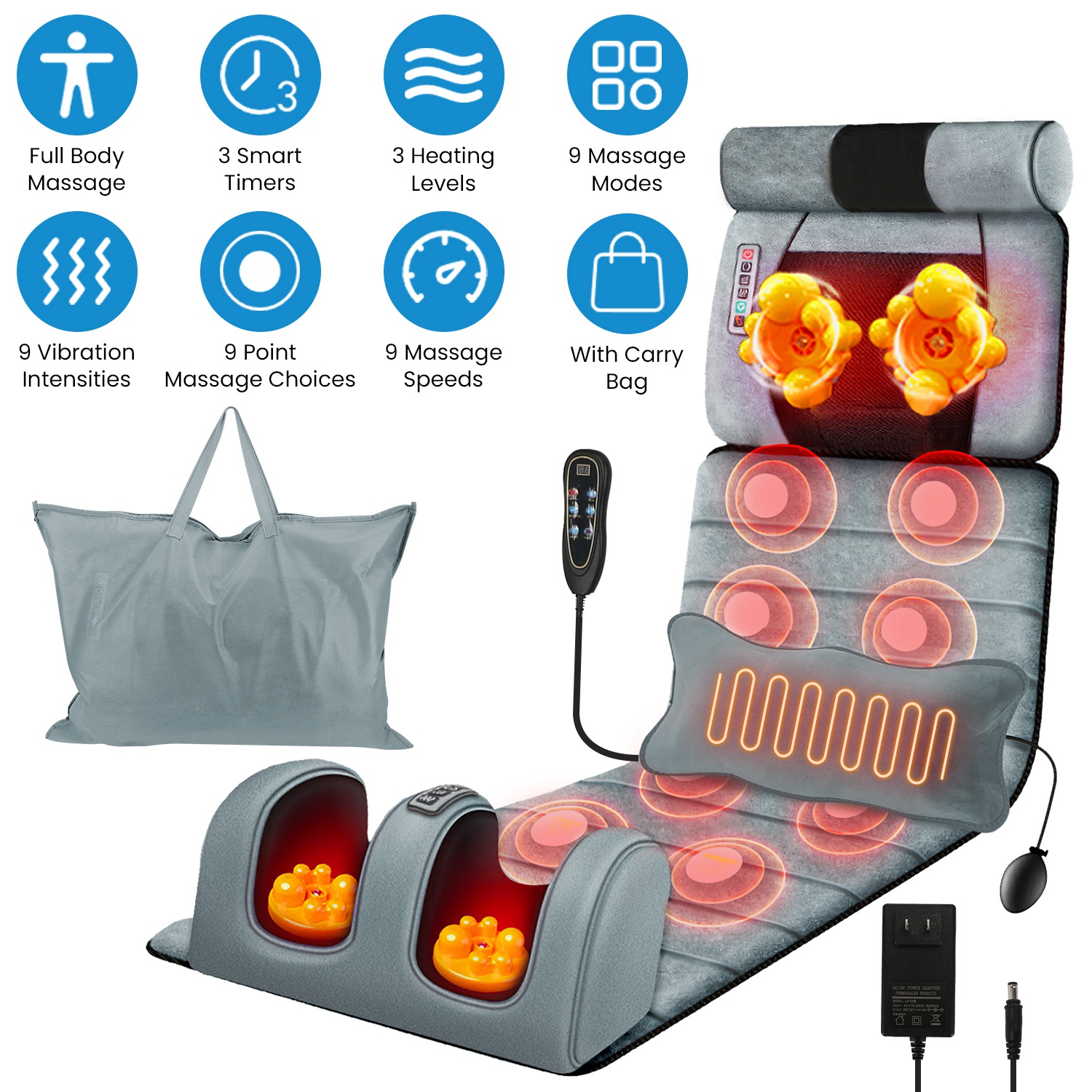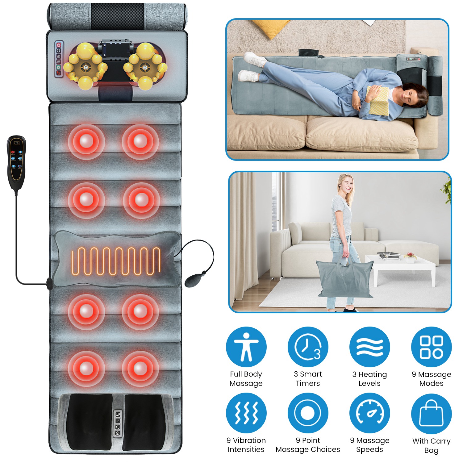 • Multifunctional Massage Mat: Our full body massage mat features 10 massage points including Back, Buttock, Waist, Thigh, Calf, and heating therapy function on lumber zones, it\'s able to give you a therapeutic massage that helps release tension, stress, and fatigue after a long work day. You can choose 9 designated vibration modes, 9 point-selection vibration modes, 3-level heating levels and enjoy full control over 9-level vibration intensity and 9-level speeds as you hit all the right spots.