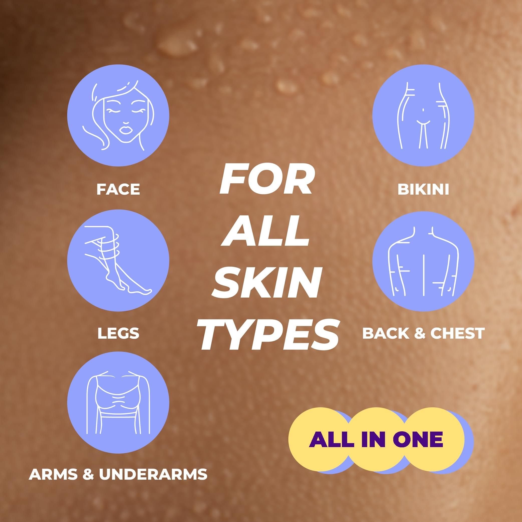 1.gentle skin sensation our new natural wax formula provides gentle hair removal and prolongs the feeling of smooth and soft skin for up to twice as long as shaving! versatile - wax beads can be applied to all types of skin and are equally suitable for legs, underarms, bikini and brazilian, facial area, eyebrow, nose, upper lip depilation for both - women and men! painless - with our premium quality depilatory hot wax you experience less pain and easier hair removal compared to